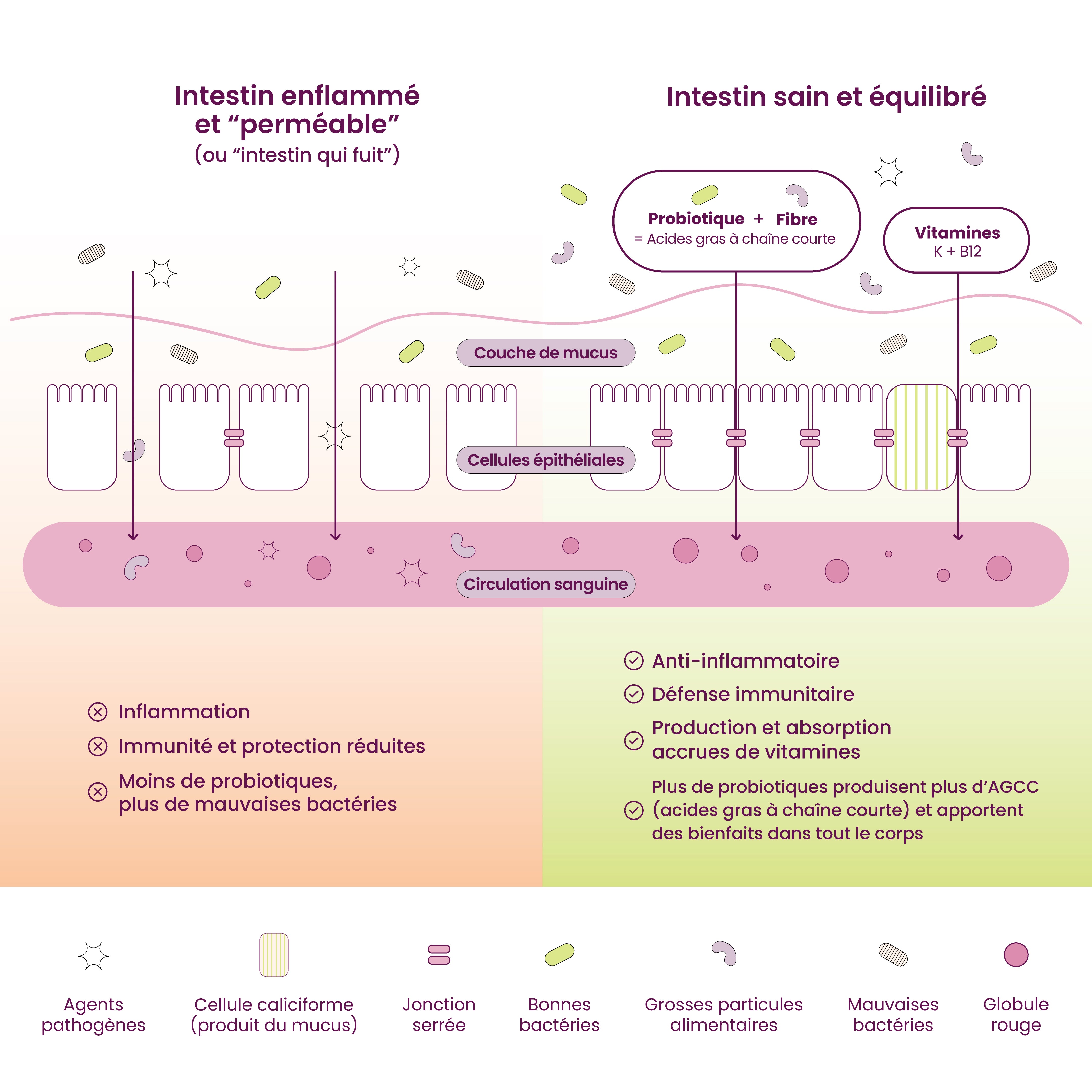 De nombreuses maladies et affections sont liées à un déséquilibre des bactéries intestinales et à un intestin perméable. Notre intestin a pour rôle essentiel de bloquer les grosses particules alimentaires, les allergènes et les agents pathogènes, mais lorsque nous manquons de bonnes bactéries pour repousser les mauvaises, nous commençons à en ressentir les effets. L'intestin perméable peut être causé par des toxines environnementales, une alimentation déséquilibrée, l'alcool ou une réaction de stress prolongée.