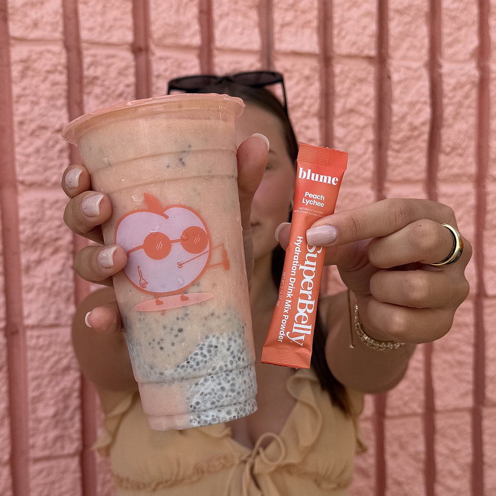 Visit any HBFace location for a complimentary peachy makeup refresh while you sip on SuperBelly Peach Lychee. Did we mention we'll be serving collab drinks all month long, plus other in-studio perks?!